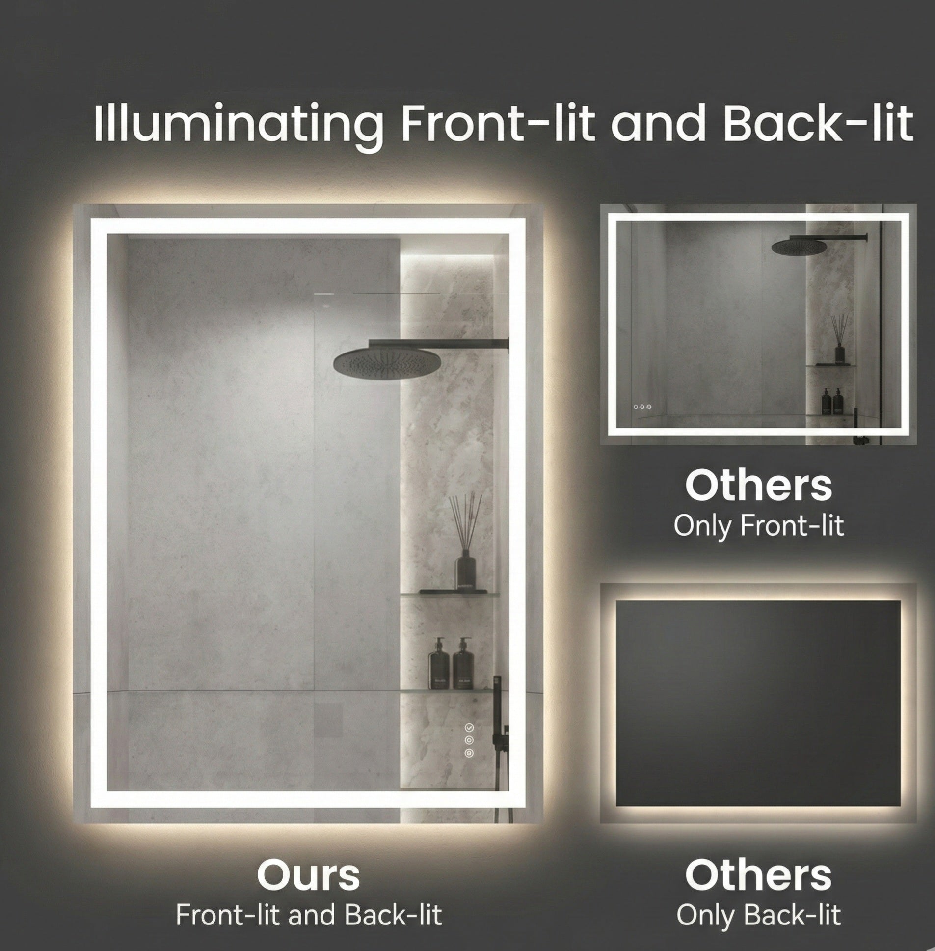 20" x 28" LED Wall Mirror with built-in Anti-Fog technology — stays crystal clear even in steamy environments, so you never lose visibility after a hot shower.